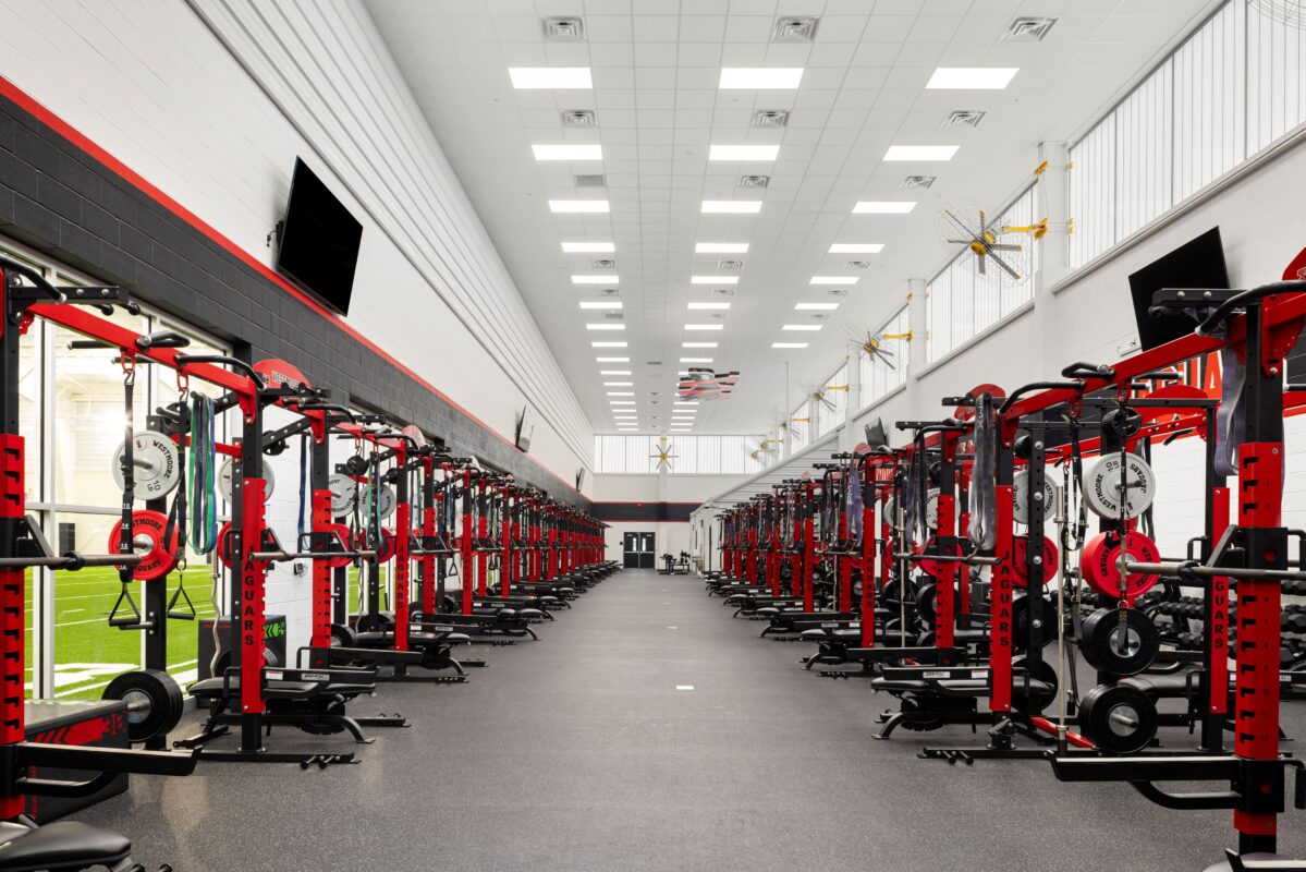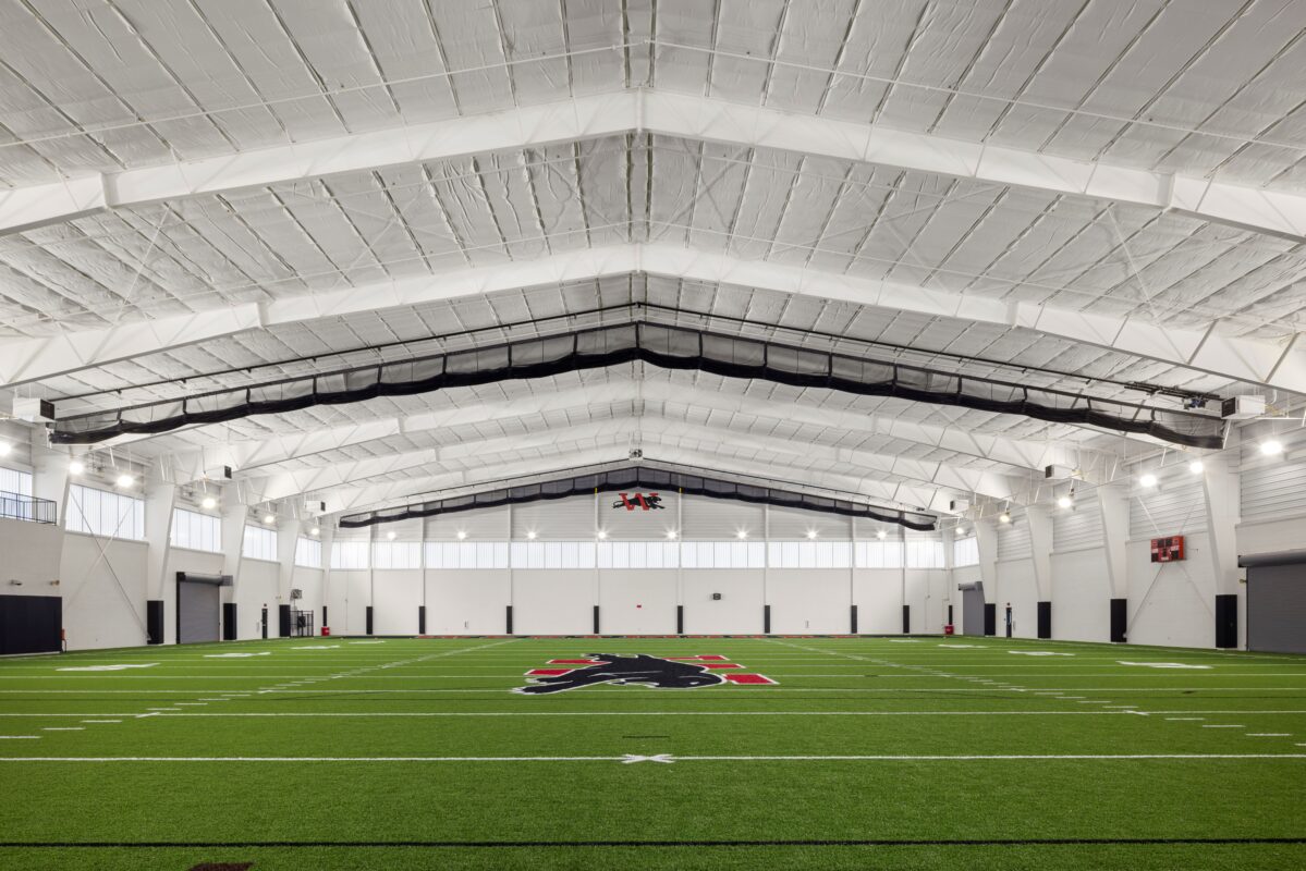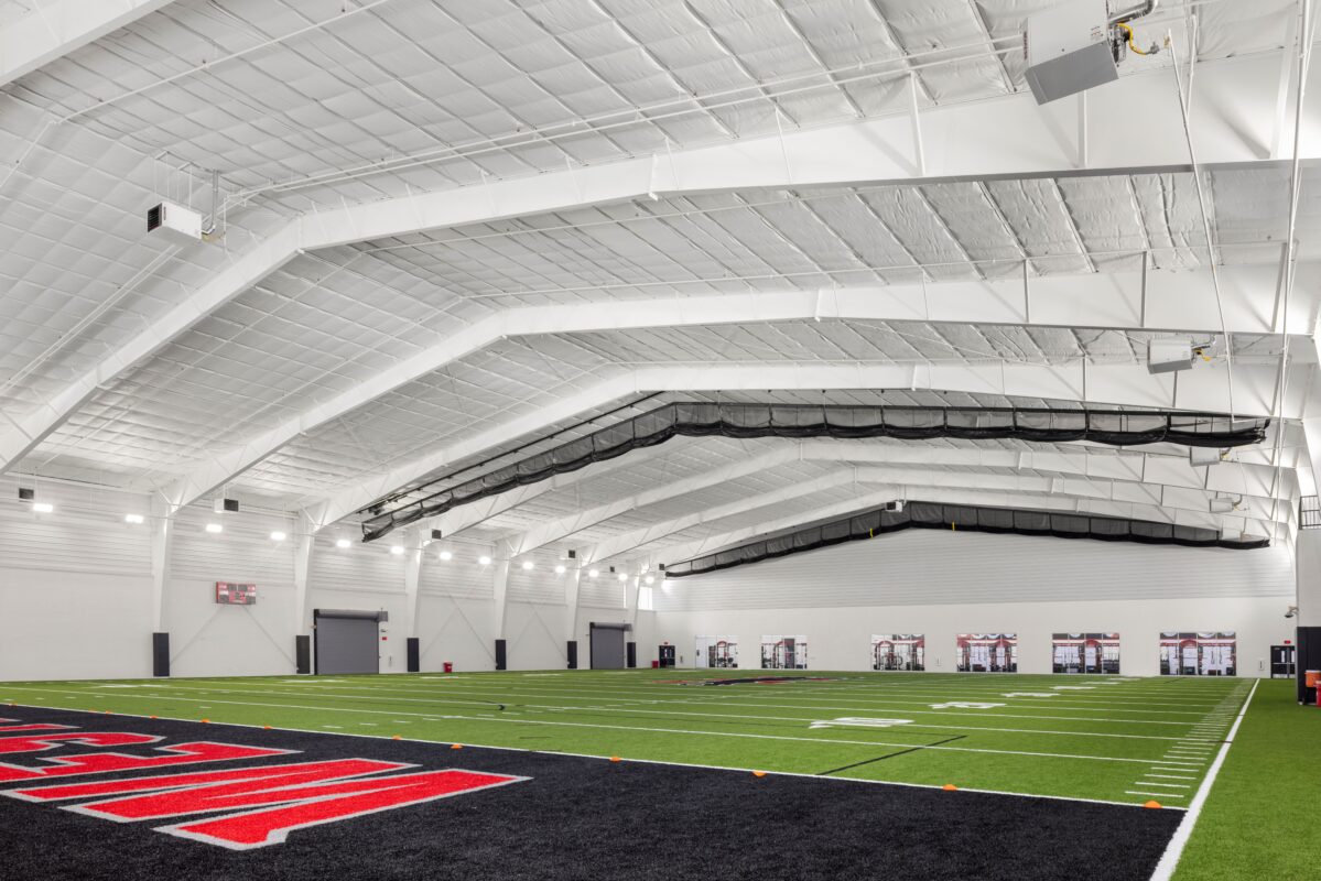 The 53,000 SF multipurpose indoor practice facility was constructed using a pre-engineered metal building (PEMB) system, with a durable enclosure composed of masonry and translucent wall panels that provide natural lighting throughout the interior. The structure houses two primary spaces: a 45,000 SF synthetic turf field designed for flexible use across football, soccer, baseball and softball, and a 5,000 SF weight room built to support athletic training and conditioning. Designed for year-round use, the facility supports a wide range of athletic programs, team practices, and offseason training.
